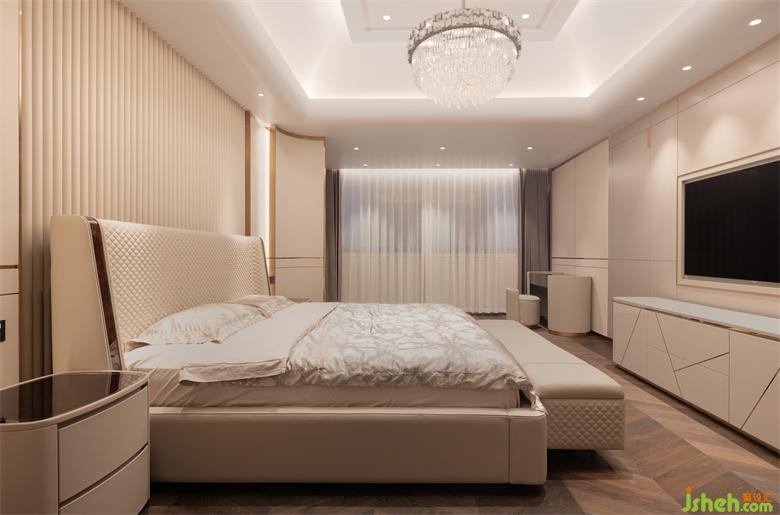 Master bedroom integrity, elegant and delicate, velvet bed products of western elegance, showing a living attitude and delicate taste of life expression. Different materials, unified tone, ultimately lead to the heart of love for a better life. The moment I looked out of the window, the luxury and elegance of the interior and the quiet beauty of nature reached a comfortable balance.
