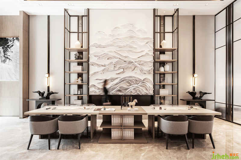 設(shè)計(jì)開始,為在軟裝設(shè)計(jì)上強(qiáng)化“書千尺”文化主題,在現(xiàn)代設(shè)計(jì)手法背景下,設(shè)計(jì)師保留了空間的中式韻味,并以“書”的不同藝術(shù)表現(xiàn)形式為延展,作為整個(gè)項(xiàng)目的藝術(shù)品運(yùn)用,來貫穿每個(gè)空間的動(dòng)線,打造視覺記憶點(diǎn)。