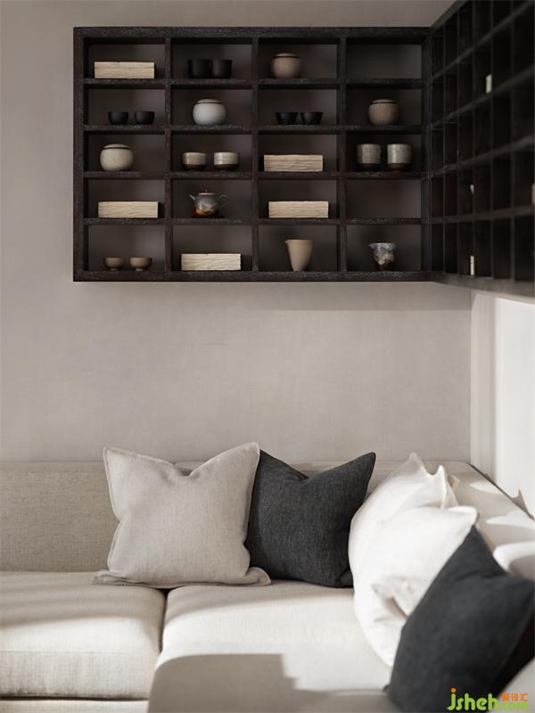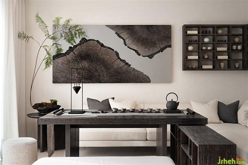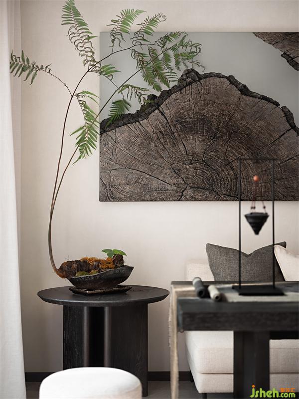 人居以融入自然為上,山間聽取潺潺的流水。大大的院子,盈盈的笑聲,人、自然、空間···和諧與共。深木色百寶格,收納各色器玩,古意盎然,隨便從山間扦插一根綠植,就得到一片風(fēng)景,純?nèi)诲羞b一派天然。