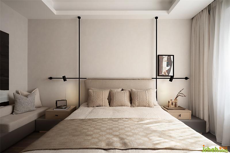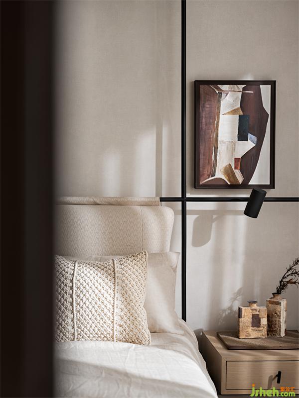 次臥中淺色的格調(diào),被床頭壁燈的暖光點亮。精致的原木床頭柜、亞麻床品和棒針粗毛線編織的可愛抱枕,一種小而美的舒適感,縈繞在空氣中。