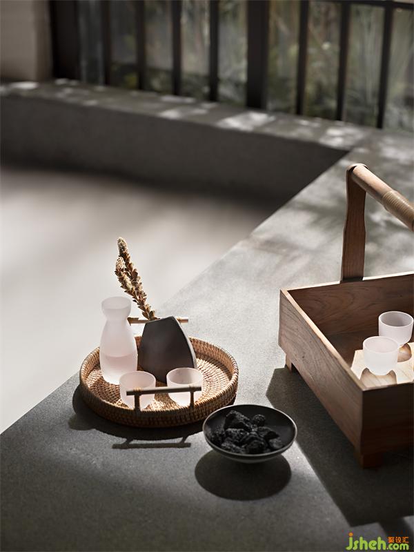 下疊餐廚空間與湯泉區(qū)緊密相連,修竹幾桿自成遮蔽的風(fēng)景。超大浴池帶來的是“溫泉水滑洗凝脂”的愜意,加之池邊提盒中梅子清酒,小酌一杯的微醺感,度假的心情隱然其中,妙不可言。