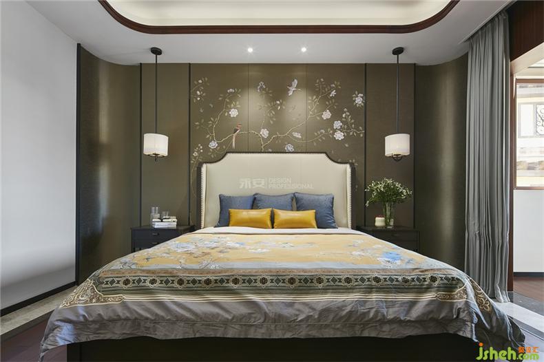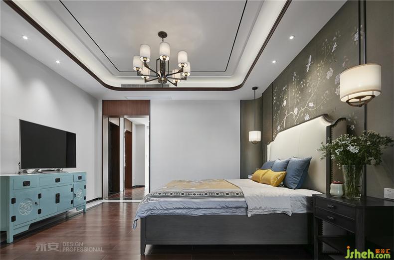 臥室的吊頂和燈具都和家里主空間采用同樣的設(shè)計手法,讓每個空間各自分明又和諧一致。電視柜用藍色去裝點,提亮了整個空間的明度,中式和現(xiàn)代的糅合呈現(xiàn)了新中式的獨特魅力。