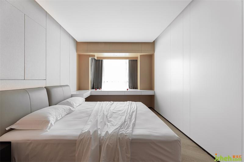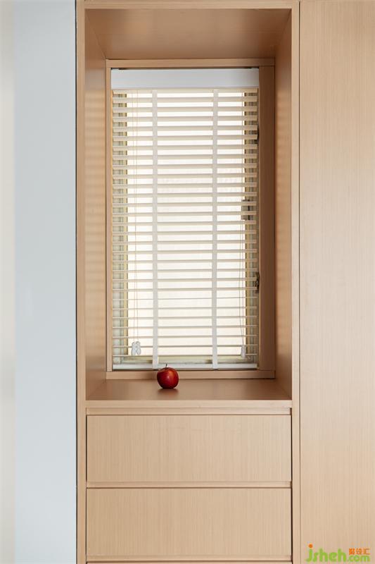 靠窗部分結(jié)合飄窗造型做成梳妝加書臺一體的桌子