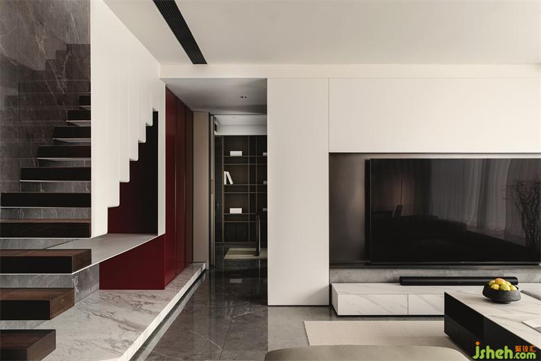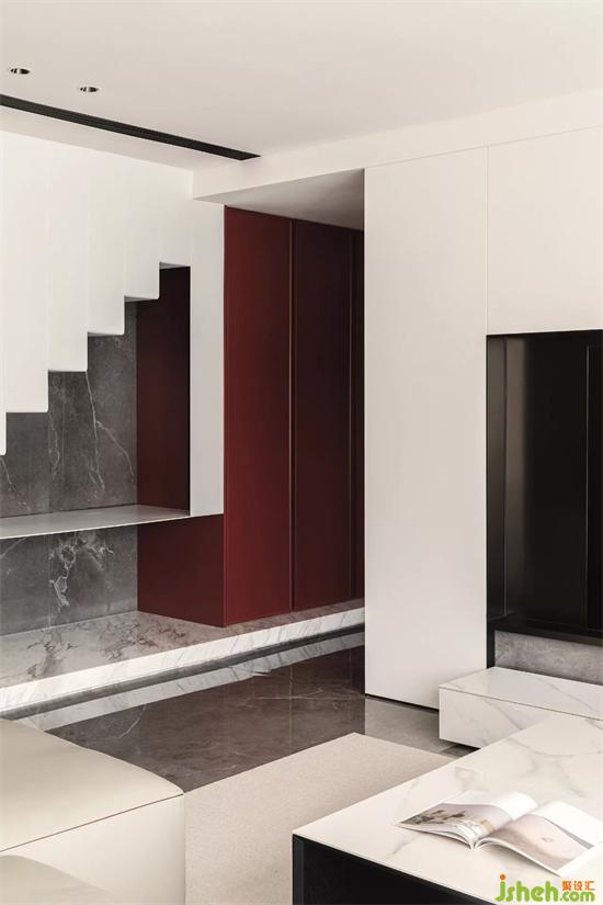 This case is a top-floor duplex residence located in the downtown area of Jiangbei, Huizhou. With black, white and gray as the main tone, with dark red in part, the overall presenting a high-level contemporary and fashionable style. The large-scale horizontal opening of the building brings outdoor light and scenery into the interior. It has superior congenital conditions. The excellent river view on the top floor has become the best "facade" in the interior.