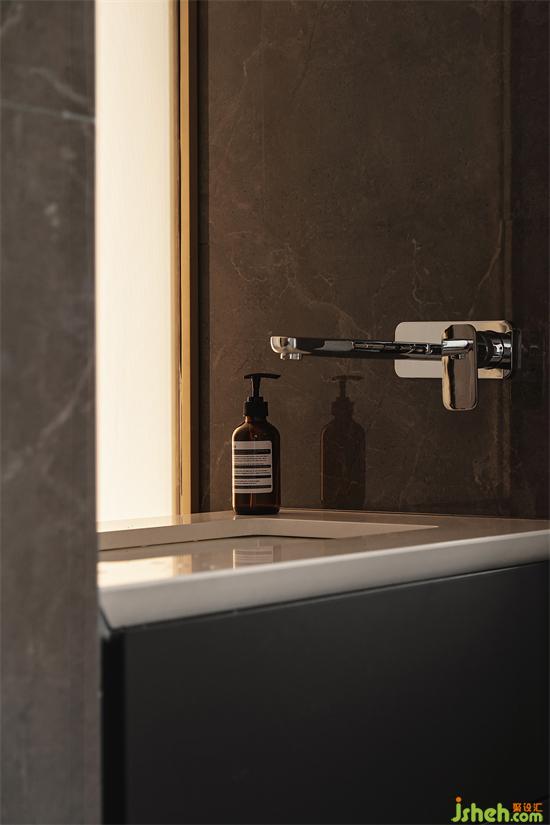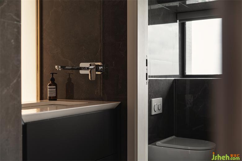 二樓客房衛(wèi)生間壁掛馬桶利用管井位,水箱完全嵌入墻體,保證墻面平整性的同時(shí)視覺效果更為干凈高級(jí)。