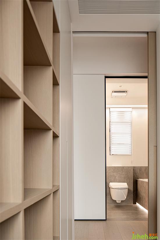 書房與主臥之間用移門分隔,不占用內(nèi)外空間。業(yè)主對隔音沒有要求,又考慮空調(diào)的節(jié)能性,此處移門是最佳選擇。