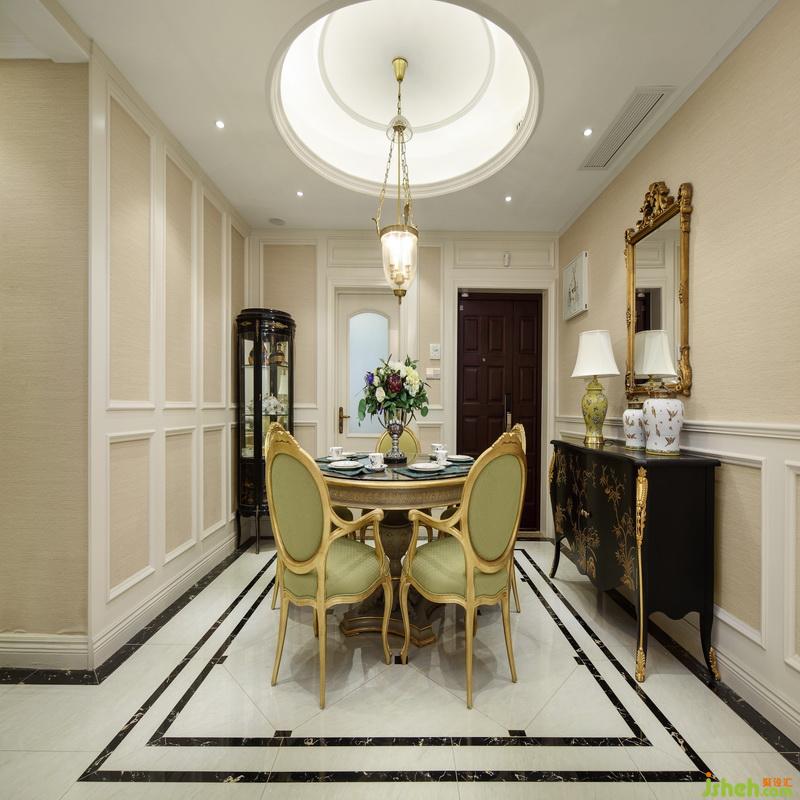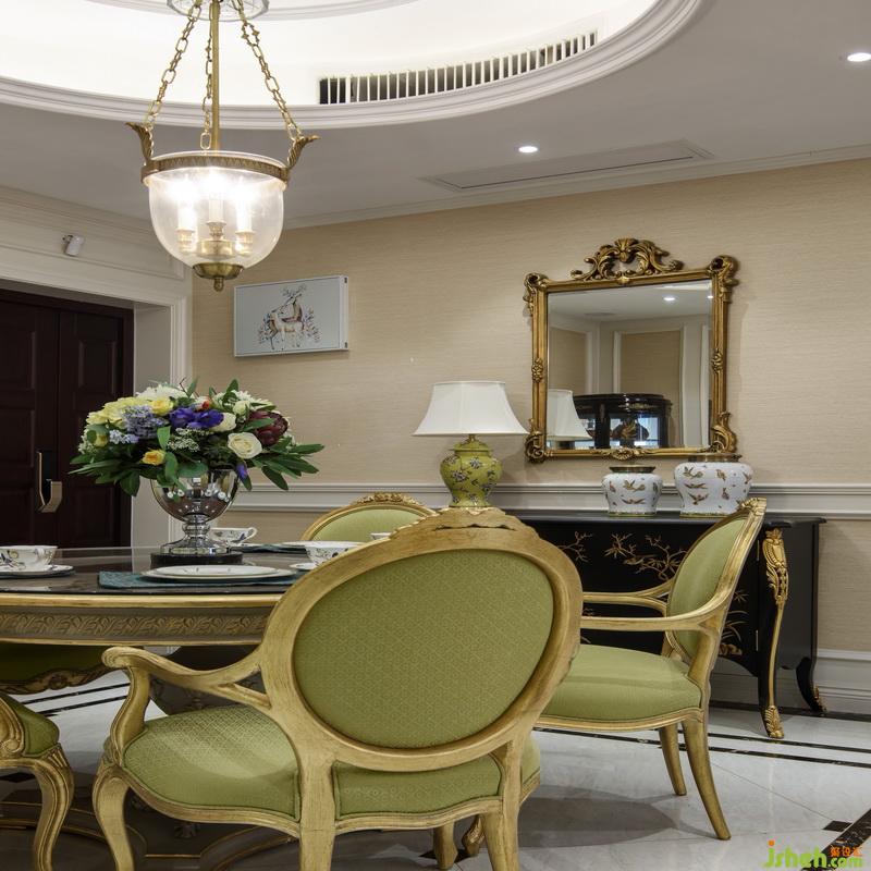 餐廳與客廳統(tǒng)一氛圍,延續(xù)美式的風(fēng)格,室內(nèi)設(shè)計(jì)師利用了簡約的手法和材質(zhì)還原古典氣質(zhì),搭配上造型別致的吊燈,營造出美式的舒適與溫馨。