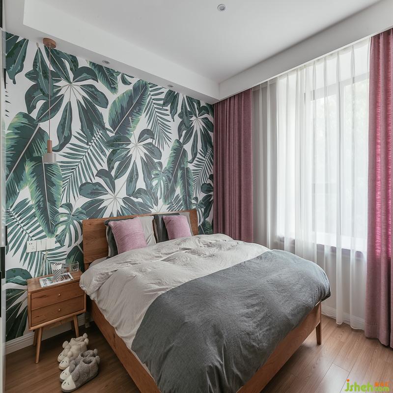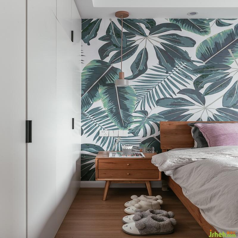 綠色如奇幻森林般的主臥背景墻給人以舒適的視覺感受,床品也以舒適為主,體現(xiàn)輕奢美式的細(xì)節(jié)。