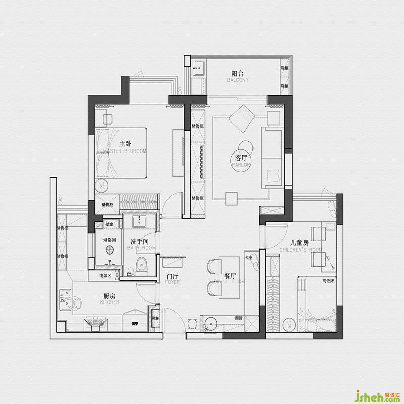 兒童房室內(nèi)設(shè)計師都設(shè)置了整排的衣柜,最大化的利用空間,有充分空間收納孩子的衣物。