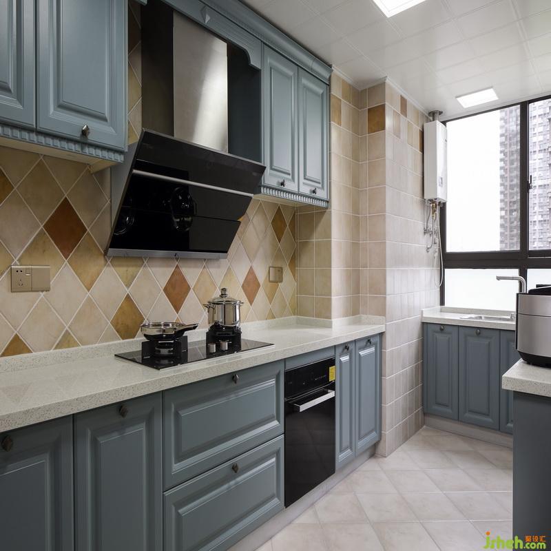 廚房和浴室延續(xù)統(tǒng)一的地中海風格,一橘一藍,讓主人在不同空間的隨意切換中感受家的律動。合理的空間布局,明快的采光設計,以一以貫之的幾何力量,提煉出主人干練的精睿生活方式。