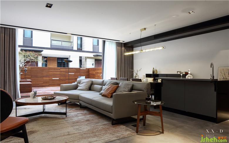 一樓的整個空間,室內設計師改動最大的就是將陽臺外擴,來增加整個空間的空間感??蛷d采取四扇落地移門,將整個室外花園與室內空間融為一體。天晴的時候可以將移門全部拉開,打開之后室內和花園是可以完全融合的,方便后期年輕人舉辦party。