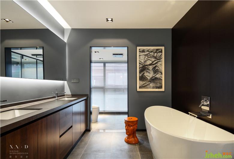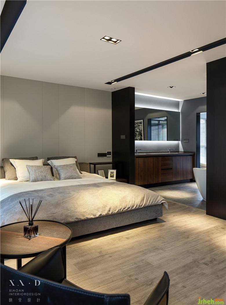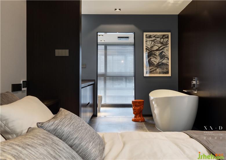 比較大膽的是,室內(nèi)設(shè)計(jì)師將淋浴區(qū)的位置完全打開,浴缸是直接放在床邊上的,這個(gè)設(shè)計(jì)在一般空間里是不會(huì)有的。整個(gè)空間上我們是一致采用了黑白灰色系的,呈現(xiàn)的方式以酒店式的套間主,這也是業(yè)主前期和我們溝通過想要呈現(xiàn)的效果。