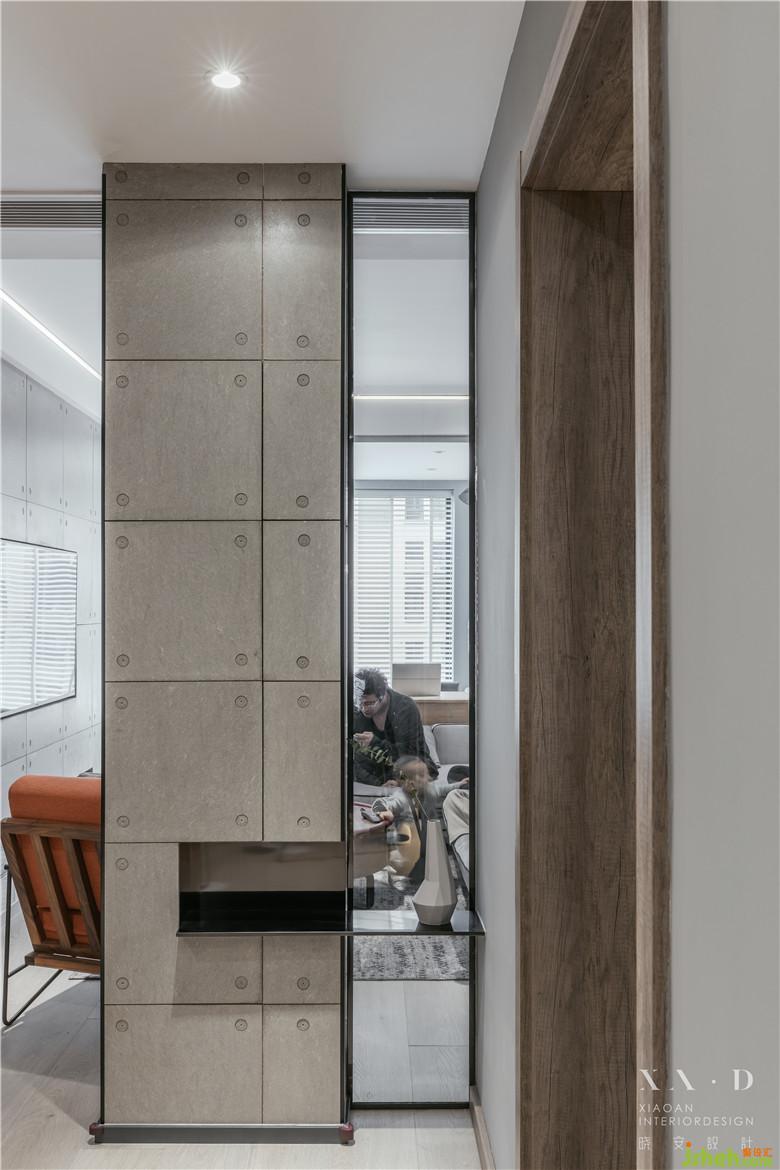 入門看去,玄關(guān)造型與背景墻相互呼應(yīng),玻璃的嵌入和客廳多了一層曖昧的關(guān)系。