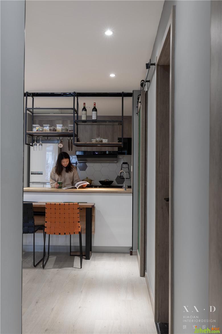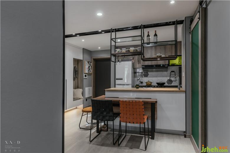 室內(nèi)設計師設計開放式的布局讓餐廳通透明亮,餐廳廚房之間的聯(lián)系也更加緊密,島臺上的置物架便于兩個空間收納。折疊的餐桌既可以作為吧臺也可以作為餐桌使用,釋放空間。