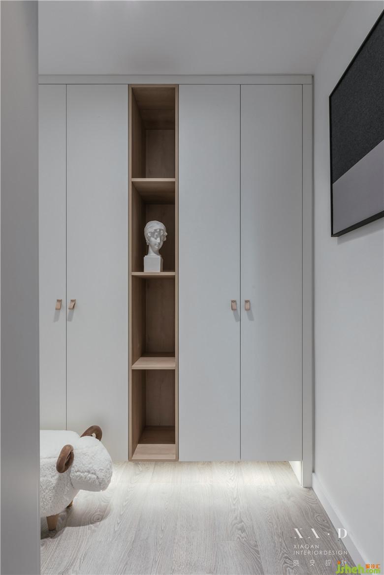 空間滿足儲物功能后,一縷木色從白色中退去。燈光營造了些許飄浮感,室內(nèi)設(shè)計師沒有采用硬質(zhì)拉手而是選擇相對柔軟的皮拉手,綿羊座凳的選擇都在表達業(yè)主內(nèi)心的柔軟。