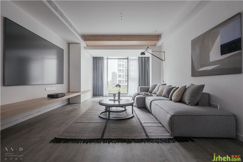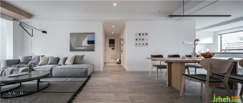 陽臺與客廳相連,頂部用木色做臺階,弱化陽臺門梁。室內(nèi)設(shè)計師使用白色的定制柜體包裹著吊頂,增強了整體性的同時用一條木色貫穿,看似破壞,實則呼應(yīng)。