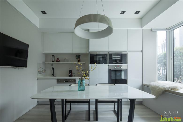 在原有空間的基礎(chǔ)上,廚房的部分做了比較大的改變。室內(nèi)設(shè)計(jì)師將原有的臥室和餐廳位置做了對(duì)掉,相對(duì)空間較大的臥室被設(shè)計(jì)成了餐廳和西廚的所在,蒸烤一類的西式料理盡可在這里完成。剛好這個(gè)空間也有一個(gè)飄窗的設(shè)計(jì),于是女主人午后的時(shí)光可以在這里悠閑度過(guò)。中式廚房躲在廊道的右手邊,大片的玻璃移門有效的滿足了廚房對(duì)于光的需求。