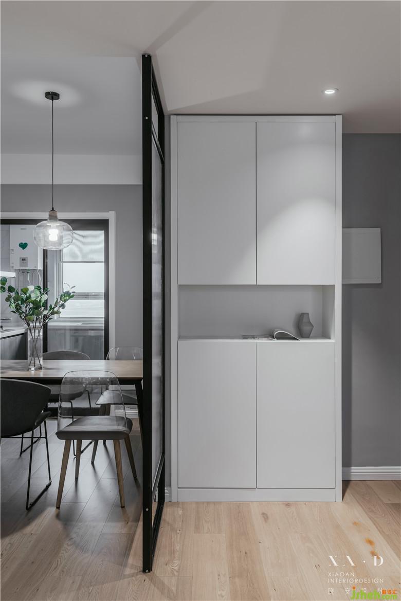 廚房空間不足時,將冰箱拿到餐廳不失為一個合理的選擇。餐邊柜與玄關(guān)、客廳、臥室的白色柜體顏色一致,與灰色基調(diào)的空間搭配起來大氣、自然。