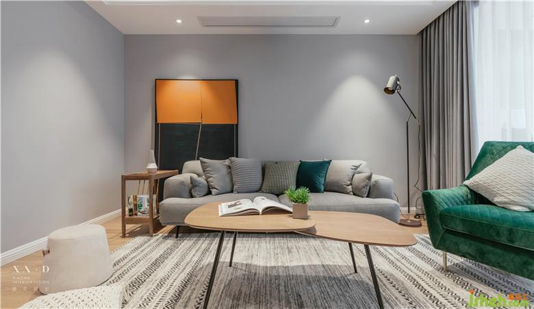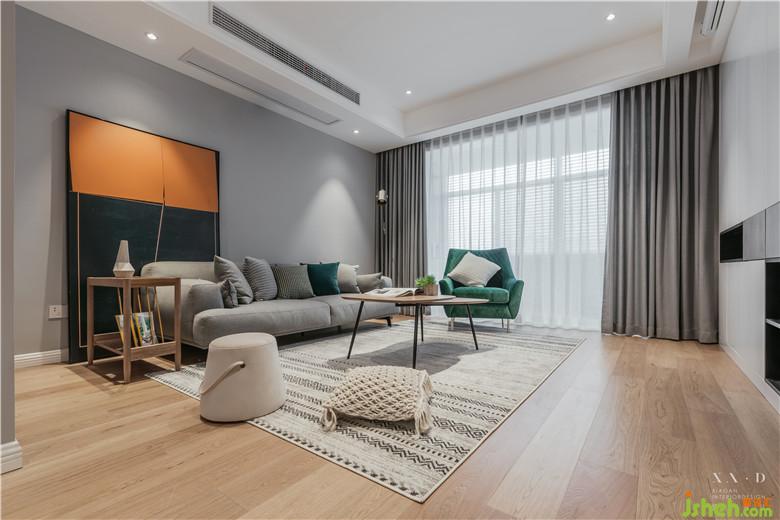 客廳硬裝上沒有多余的造型,墻面灰色乳膠漆的選擇,給后期軟裝搭配留有充分的發(fā)揮空間。灰色基調(diào)的空間里加上墨綠色的單人椅和橙色抽象的裝飾畫,簡約舒適的空間中多了一絲活潑。