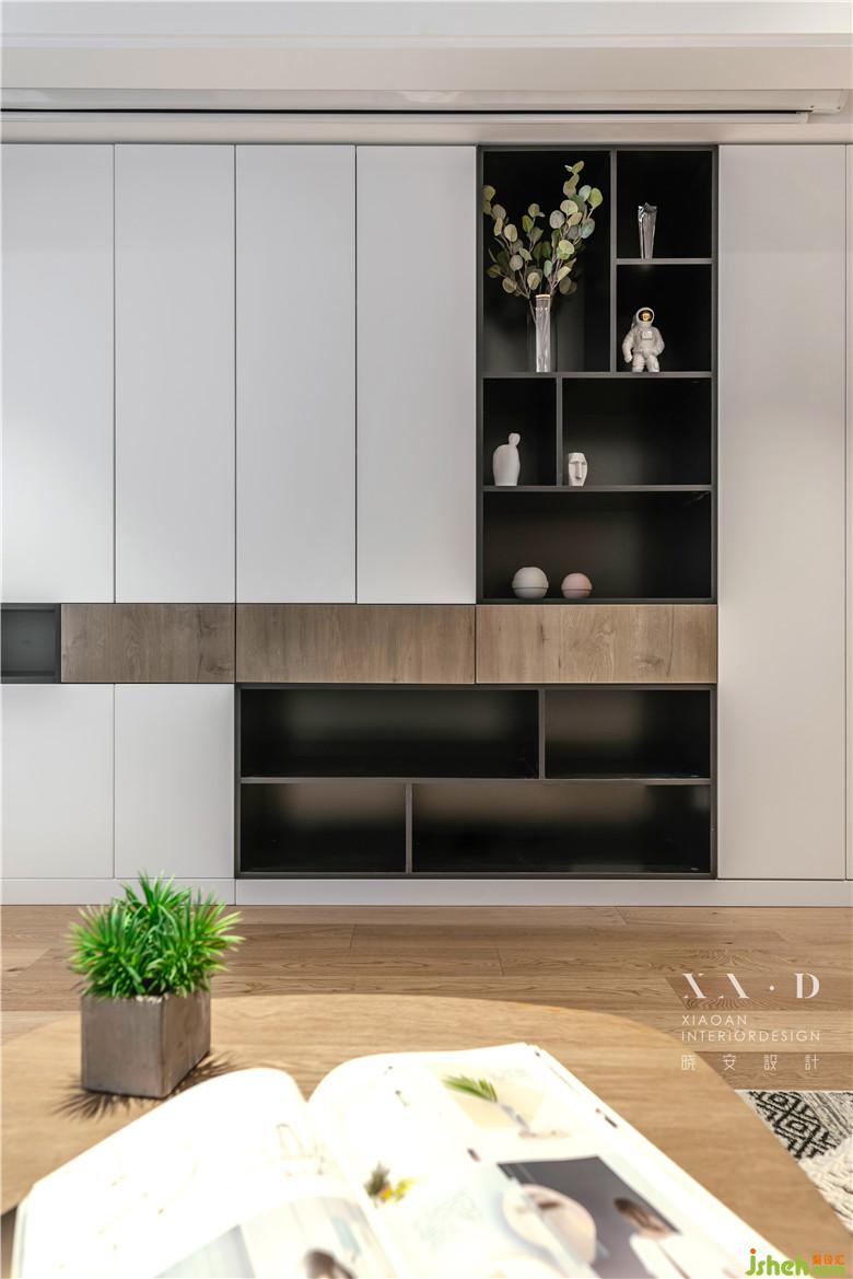室內(nèi)設(shè)計師拋棄傳統(tǒng)電視與電視柜的組合,采用整面的儲物柜,充分滿足了各種零碎物品的收納,讓空間更加清爽干凈。可調(diào)節(jié)的投影幕布保留了舒適的觀影功能,不占用多余空間。