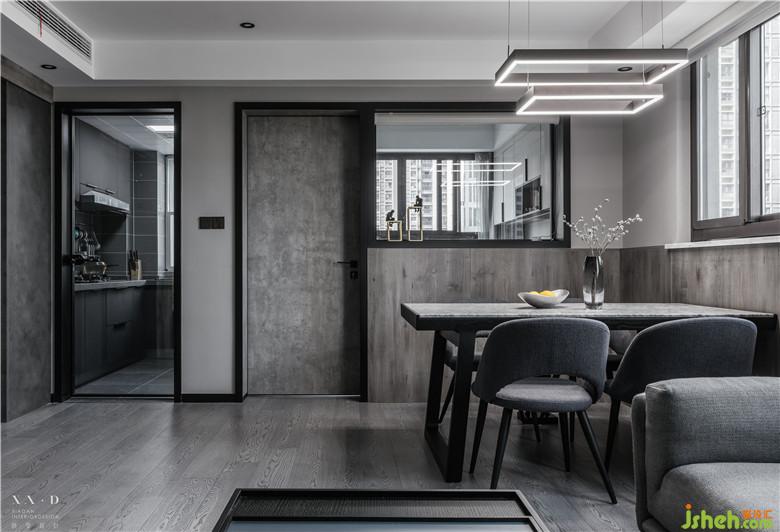 室內(nèi)設(shè)計(jì)師運(yùn)用開闊的空間設(shè)計(jì)手法,將餐區(qū)、客廳相連,擴(kuò)大視覺感受,設(shè)計(jì)出滿足個(gè)性化生活需求的流暢動(dòng)線?;疑蹬c木飾貫穿空間,燈具由幾何線條塑造造型,玫瑰金色外觀增加美觀度。