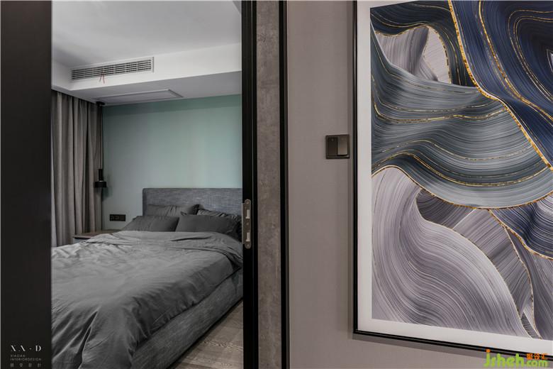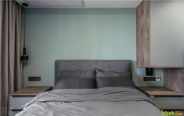 主臥室內(nèi)設(shè)計(jì)師采用灰色棉麻床品,簡單卻富有品質(zhì)感。床頭單側(cè)考慮與衣帽柜相結(jié)合,形成步入式衣帽間。