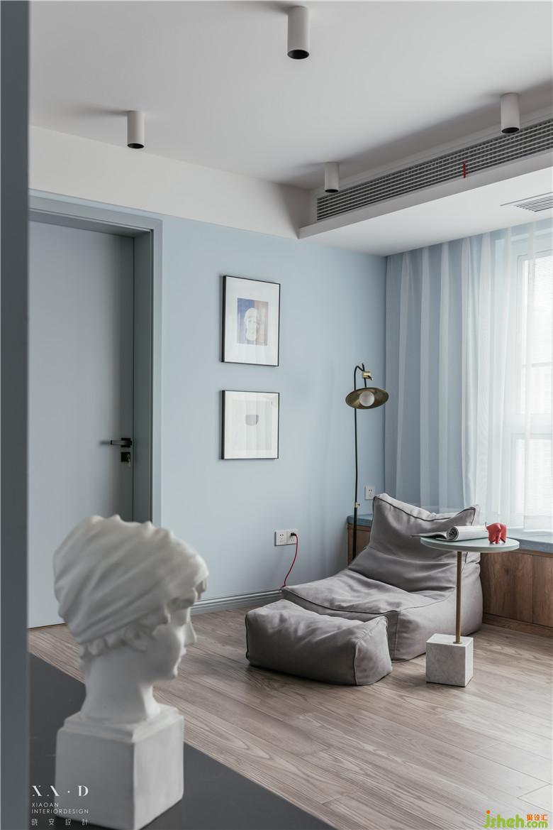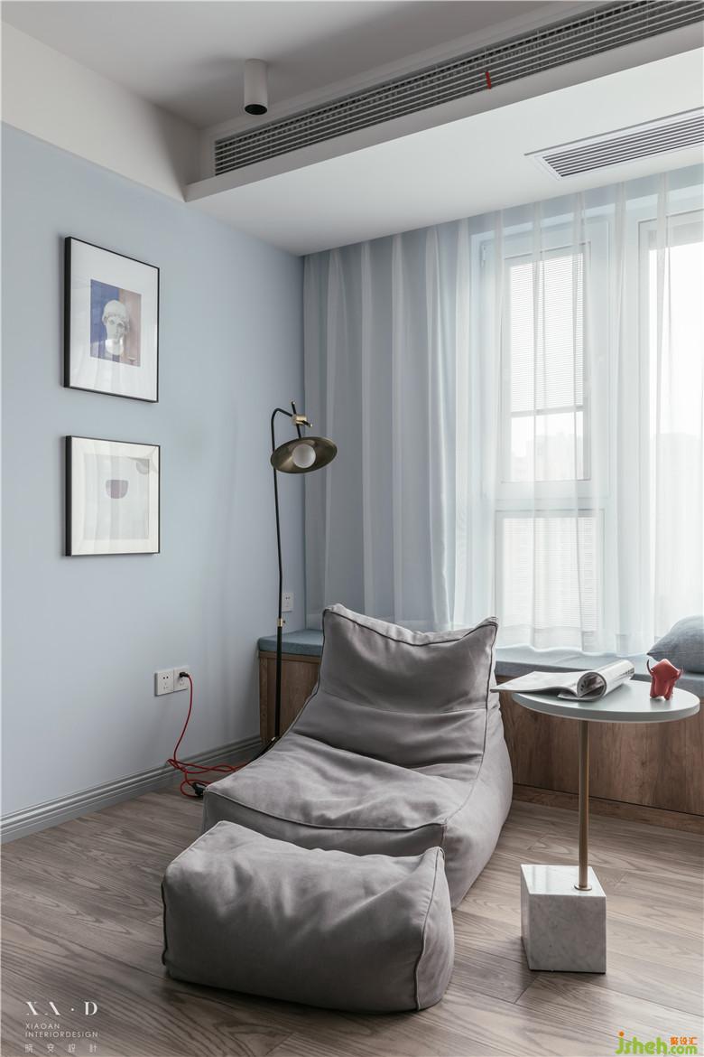 長(zhǎng)方形的卡座靠著落地窗,貫穿了整個(gè)客餐廳,不論是光線、空間,還是視覺上都很享受。懶人沙發(fā)代替了常規(guī)的沙發(fā),空間更加自由、開闊。