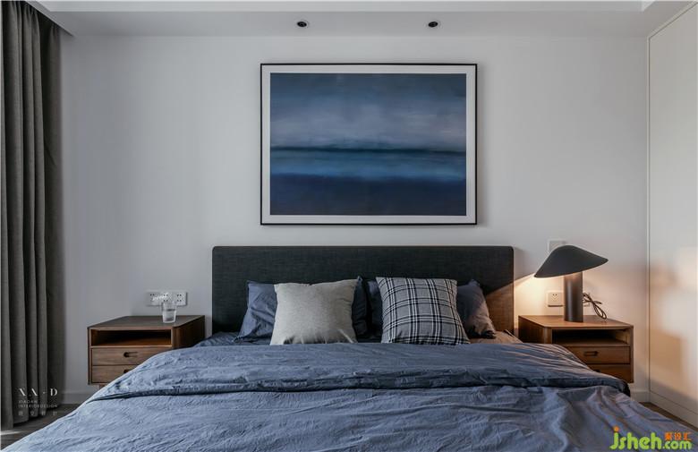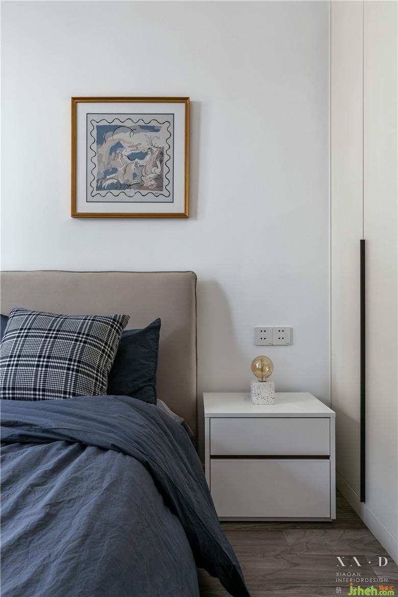父母房采用了胡桃木家具,白色的墻面使用一幅藍色的話點綴空間,與整個空間起到一個串聯(lián)的作用。