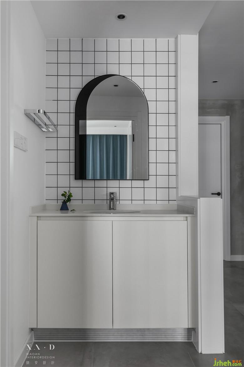 作為網(wǎng)紅款的小白磚與拱形的鏡子相映成趣,離地的臺盆柜,巧妙的避開了衛(wèi)生死角的產(chǎn)生。