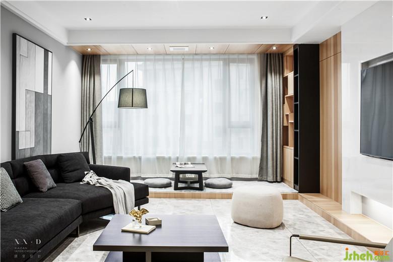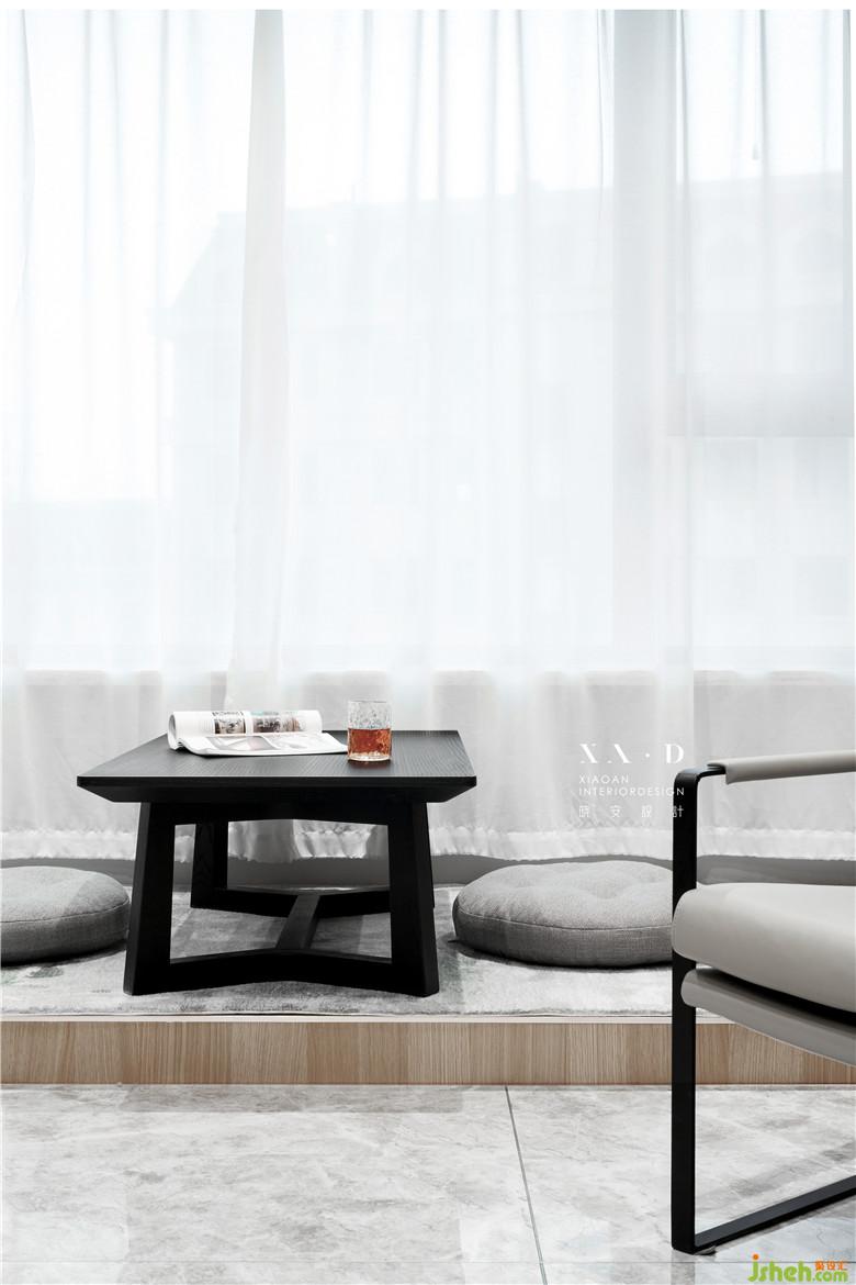 客廳的背景選用的是大理石,下面用木飾面做了地臺(tái),由于業(yè)主喜歡喝茶,所以室內(nèi)設(shè)計(jì)師把原有的陽臺(tái)直接改成了茶室,這樣整個(gè)茶室的地臺(tái)延伸到電視墻下,用地臺(tái)把茶室和電視背景墻聯(lián)系起來。