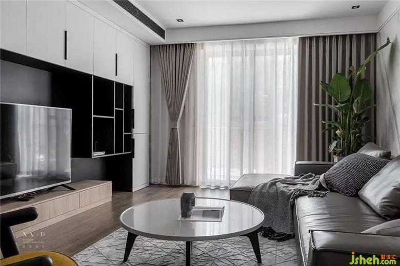 原戶型只有一個入戶門,因?yàn)槭且粯?,所以我們把原來南陽臺的門悶掉直接融入到電視背景里,這樣整個電視背景在客廳中就很完整。
