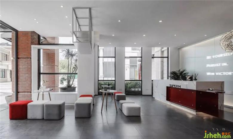 吧臺也用了紅色來點綴整個白色空間,做了懸挑,200公斤的鋼板仿佛掙脫了萬有引力,室內設計師使整個紅色越發(fā)的跳躍且明亮,吧臺懸挑的紅色設計隱喻了新鮮的血液(教練團隊),帶領我們(健身的人)循環(huán)于心臟的流動,重復的對抗,沖破,使我們更加健康向上。