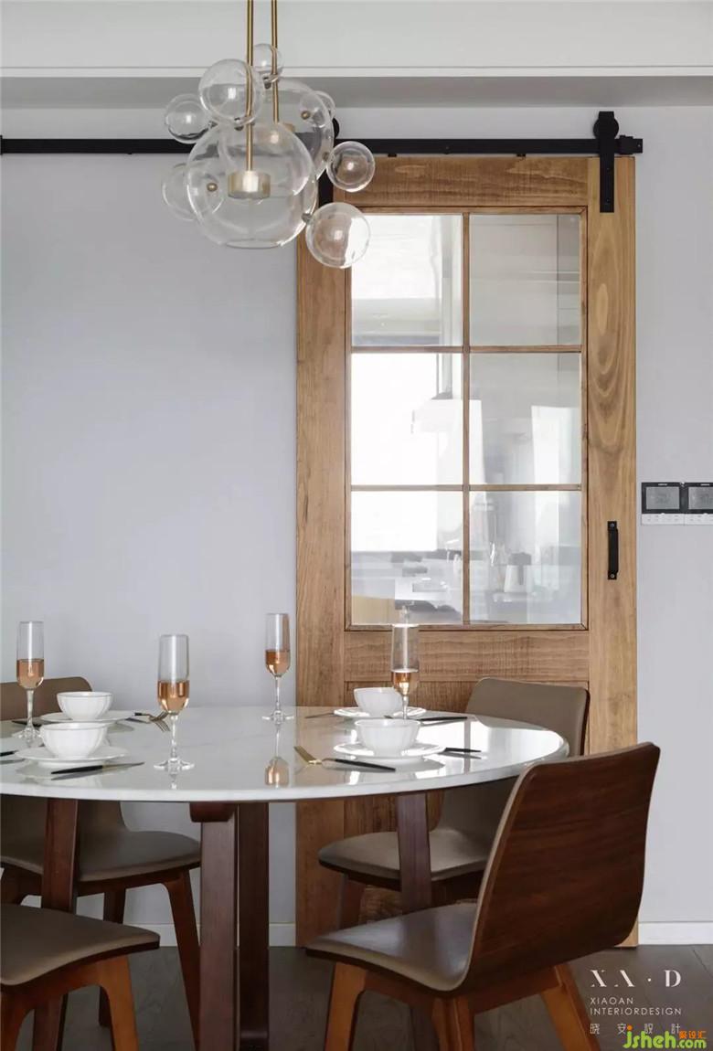 廚房的門選用了比較有意思的門型,谷倉門,一是可以用平移的方式又不占用廚房和餐廳的開門空間,二是可以起到裝飾性的效果。谷倉門選用格子玻璃,這樣有效利用了原本廚房的采光。