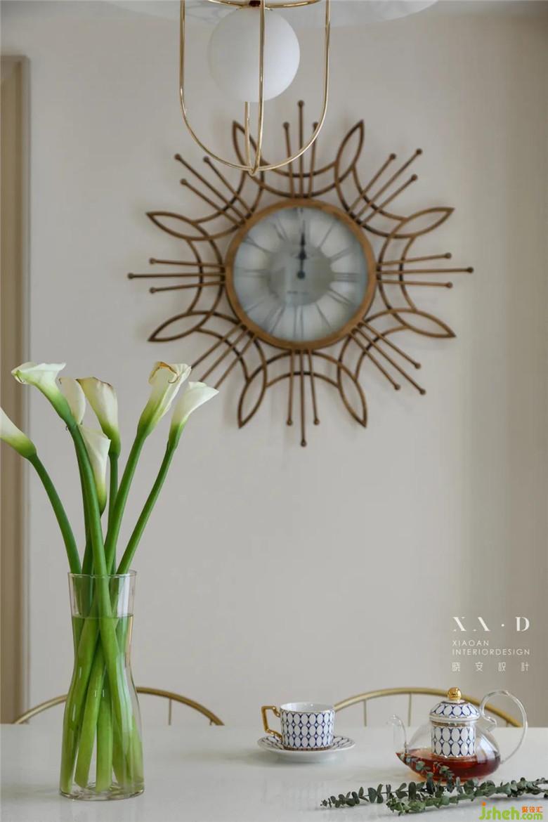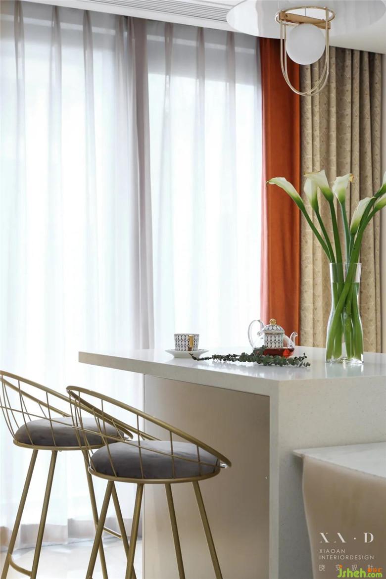 午后閑暇,銅制的花形時(shí)鐘讓時(shí)光流得更慢。纖細(xì)的金屬高腳椅,舒適而自由。坐在島臺上煮茶看花,午后的陽光透過窗戶照射進(jìn)來,渾身暖融融,那一刻,就懂得了裝修公司設(shè)計(jì)中流動的節(jié)奏感。