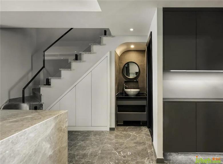 樓梯之下,別有洞天。裝修公司設計師抓住了這一方三角形空間,把雞肋變成了美味的盛宴。邊角的部分變身儲物柜,又在另一側安放洗手臺和鏡柜,讓浴室的干濕分離更加到位。