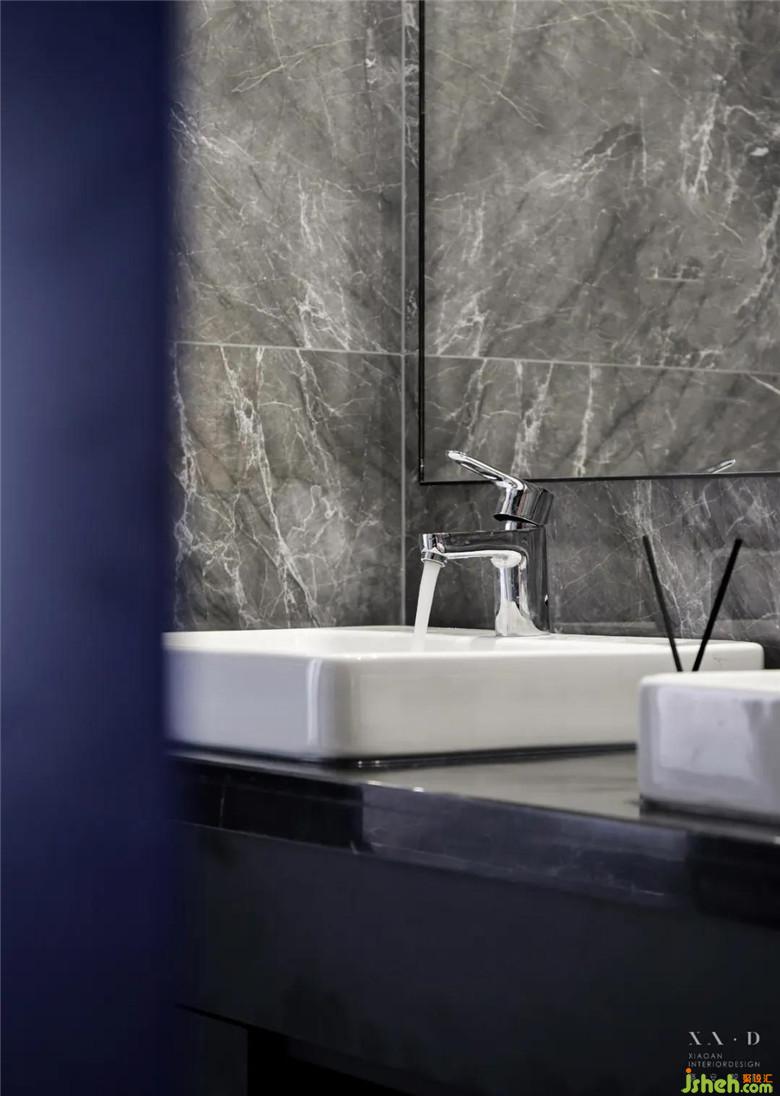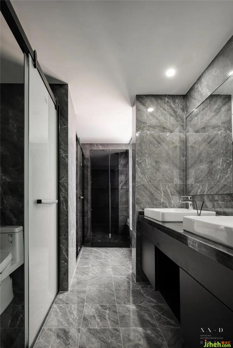被黑色面板所連接起來的兩個臺上盆,讓一家人擁有了一同洗漱的互動空間。被大理石所包裹的浴室里,干凈且明亮,讓人能夠卸下心防,在衛(wèi)生間徹底洗盡身心。