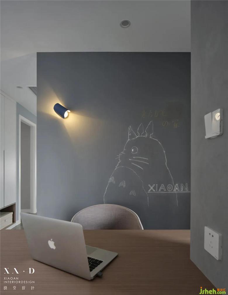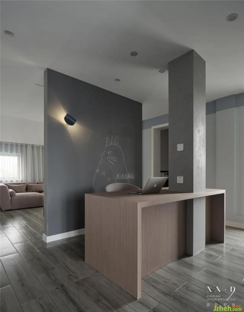 二樓的空間被承重柱所改造的隔斷墻一分為二,涂鴉黑板墻與電視墻承前啟后,照應(yīng)家居生活中的玩樂與趣味。妻子在沙發(fā)上津津有味地看電視,可愛的朱古力騎著彩虹小馬,我在認(rèn)真批改著學(xué)生的作業(yè),生活就是如此美好。