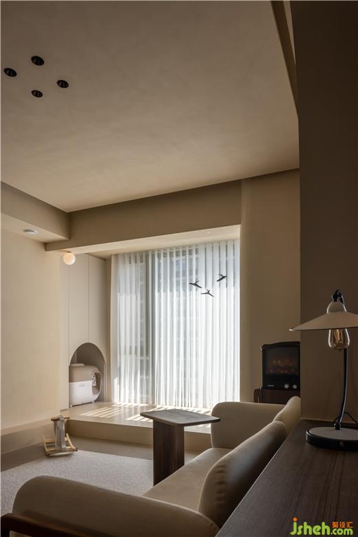 地臺向電視背景蔓延,實現(xiàn)呼應(yīng)的節(jié)奏與秩序,勾勒拱形建造貓咪私屬空間,模糊人與寵物生活的邊界。運河與岸裝修設(shè)計以球形壁燈“召喚”飛鳥裝飾,縈繞出悠遠輕靈的空間意境。