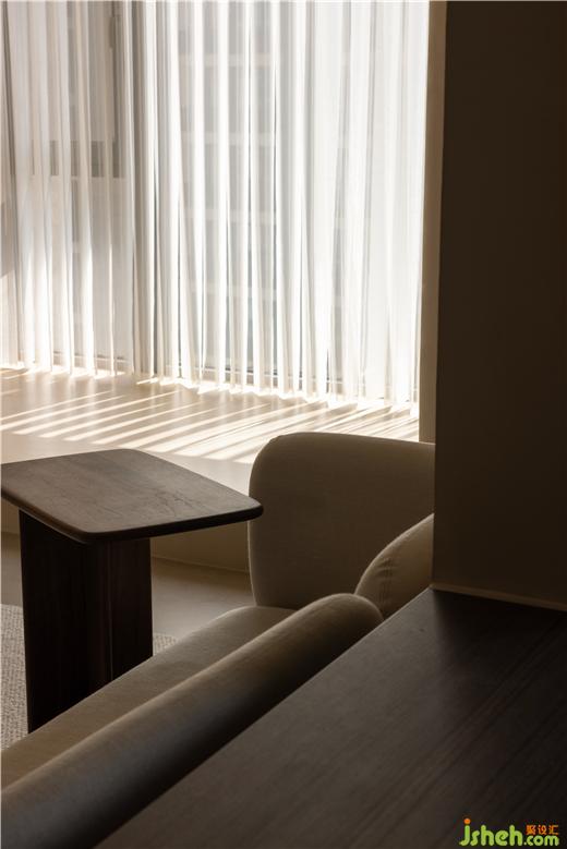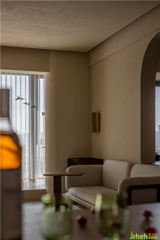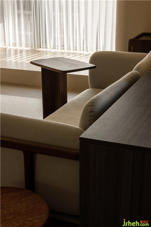 運河與岸裝修設(shè)計以編織紋理模擬水流波動的情景,運用以深賦淺的藝術(shù)筆法,增強客廳的明朗感。胡桃木色糅合框架結(jié)構(gòu),展開布局的敘事美感,以小巧邊幾補充客廳的功能性,同時擴張了開闊的活動空間。