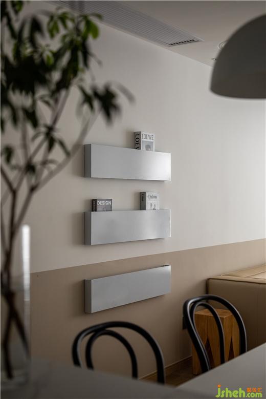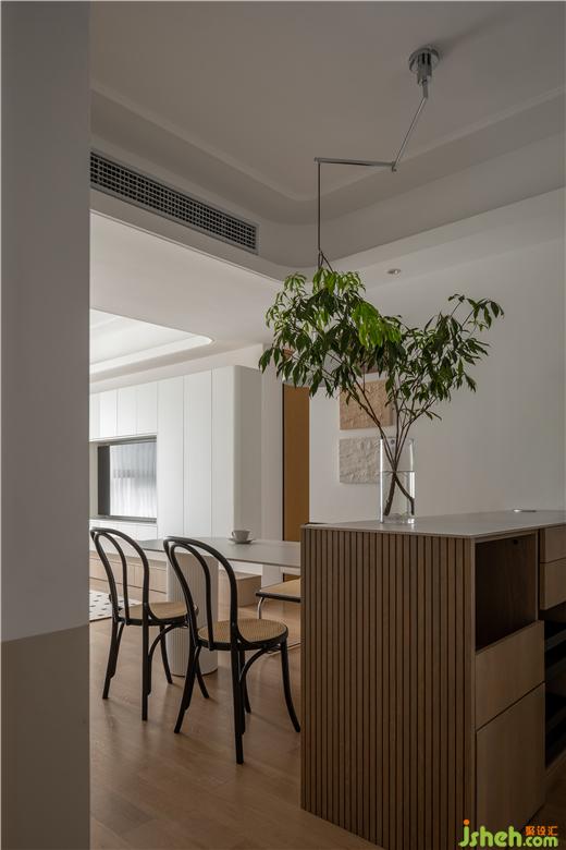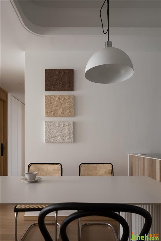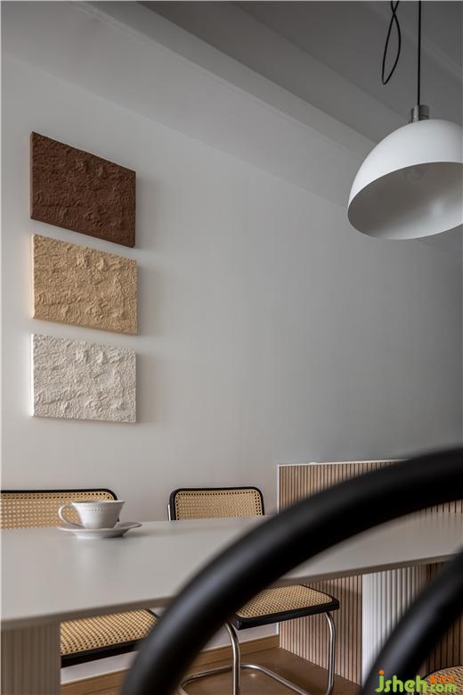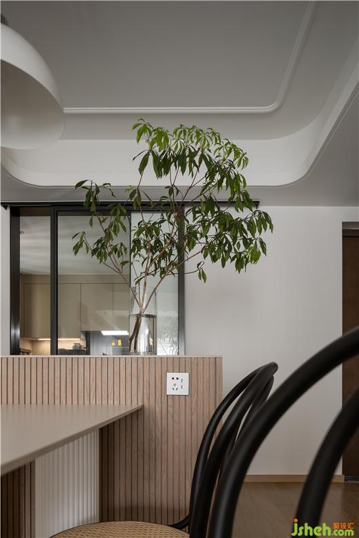 美的云筑家裝設(shè)計提取餐桌圓柱上的條紋元素,進行“稀釋”處理,最終以三段“平行線”裝飾客餐廳過渡區(qū)域,在過道盡頭形成一道新的風景,也讓家更有一種漫游感。稍微拓寬“平行線”的厚度,極簡的墻飾搖身一變,具備了收納功能。