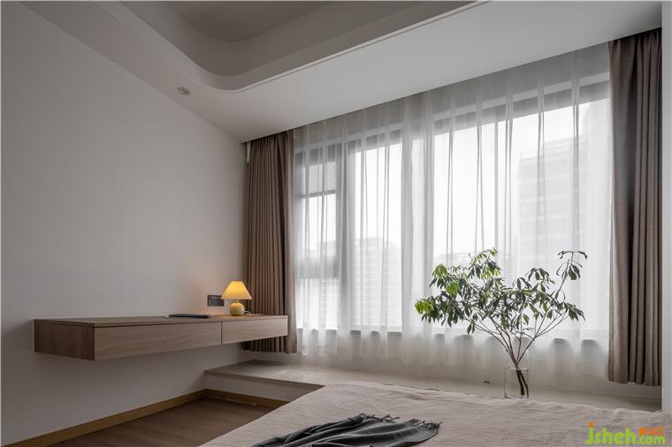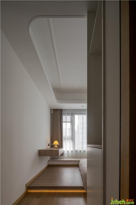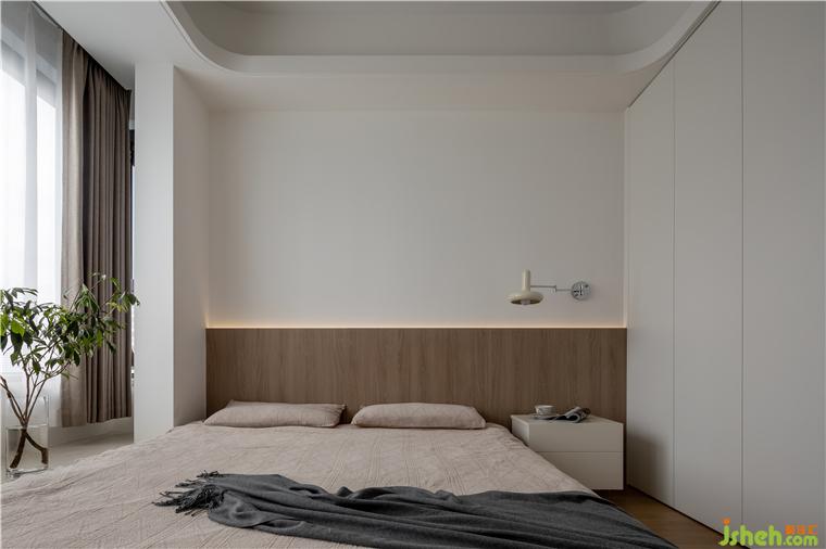 定制通頂衣柜,構(gòu)筑雙層地臺,預(yù)留閱讀區(qū),促成L形動(dòng)線,方便起居生活。采用木板上墻的手法,為睡眠縈繞安穩(wěn)感,嵌入暖色燈帶,以光書寫空間層次,整個(gè)臥室給人一種素雅無華、舒適無邊的感覺。
