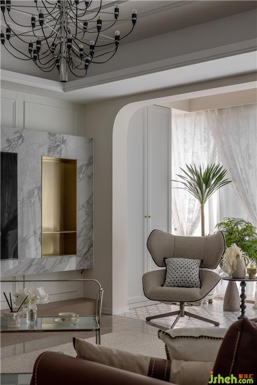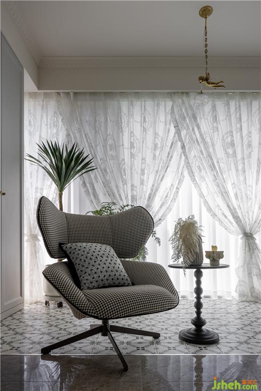 “從內(nèi)心深處,我們是希望房子能變得有個(gè)性一些的?!痹诳蛷d與陽臺(tái)空間的劃分上,弧線是比直線更具哲理感的選擇。天鵝港豪宅設(shè)計(jì)藝術(shù)借由曲線呈現(xiàn),也由對比產(chǎn)生。在沙發(fā)、可移動(dòng)邊幾、雙層夢幻簾之間,形成了空間量感上的不對稱。