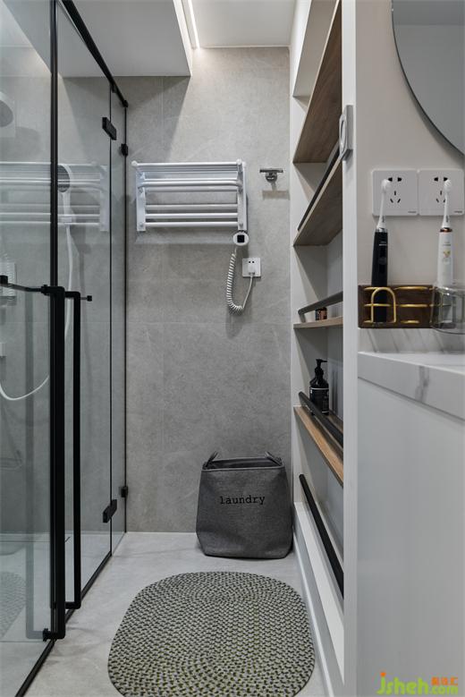 主衛(wèi),于清淺基調(diào)內(nèi)點綴深黑線條和暖金色澤,瞬間消弭了冷硬的體量感,調(diào)和出蘊含潔凈美、高雅性、便利性的空間秩序。大理石紋理讓人倍感放松與寧靜,滑動推拉門有效規(guī)劃出干濕區(qū)域。