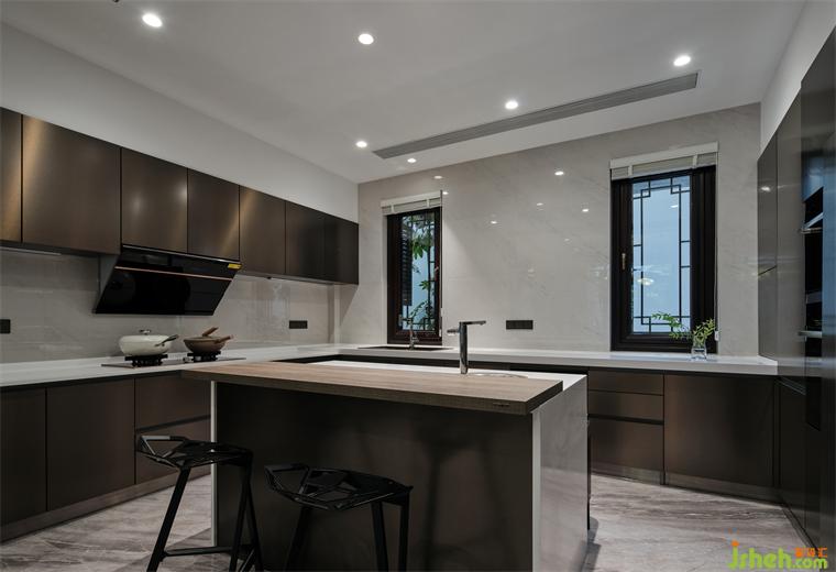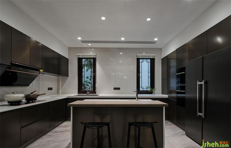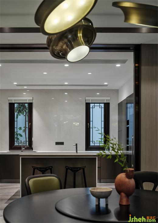 以島臺(tái)為中心,打造中西合并的烹飪環(huán)境,保留傳統(tǒng)窗花,搭配天然石紋與金屬的質(zhì)感,烘托出親近煙火,卻不失高雅格調(diào)的空間情態(tài)。
