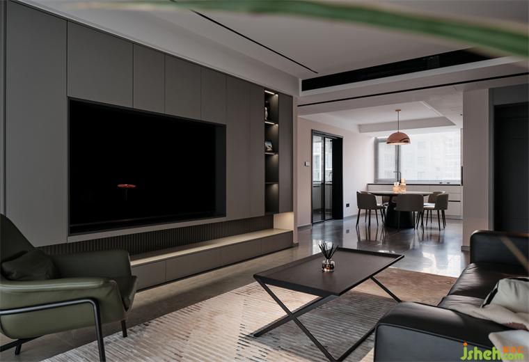 大平層裝修設計利用統(tǒng)一色塊收納儲藏空間,細分從上至下的凹凸比例,糅合均勻的條紋,化解了電視背景墻的沉悶感與壓抑感,衍生出側(cè)旁的展示空間,達成一種視覺上的重輕平衡。