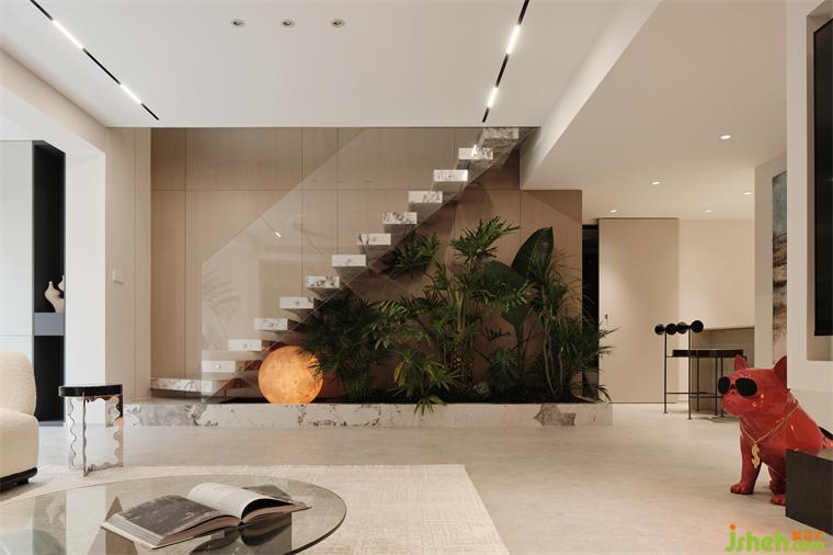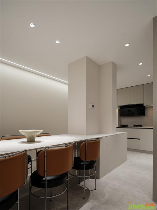 復式裝修設(shè)計憑借天然石紋的恢宏氣韻,傳遞天地靈氣,疊層暗色收納柜,巧妙糅合了視覺層次美感與實用功能需求,助力培養(yǎng)紛繁多樣的生活儀式感。By virtue of the magnificent charm of natural stone, it conveys the aura of heaven and earth. The stacked dark storage cabinet cleverly blends the aesthetic feeling of visual level and practical functional needs, helping to cultivate the diversified sense of life ritual.
