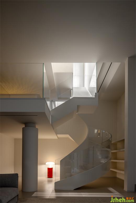 復(fù)式設(shè)計優(yōu)雅的旋轉(zhuǎn)樓梯則猶如一件精心雕琢的藝術(shù)品,矗立于空間之中,運用玻璃材質(zhì),不僅維持了整體美感,更讓光線能夠自由穿梭,為空間注入靈動氣息。