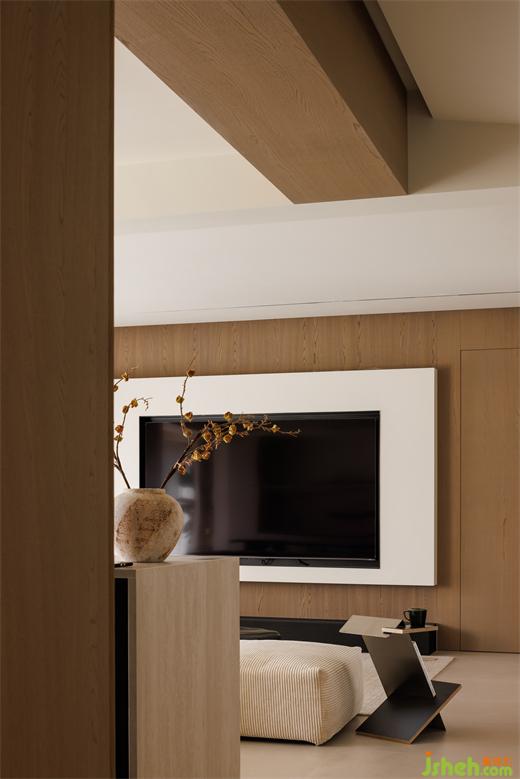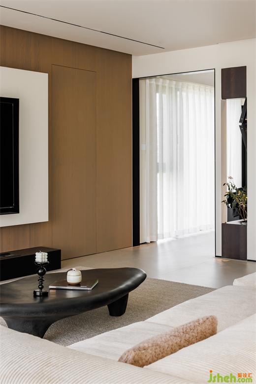 客廳沒(méi)有選擇整墻木飾面,避免空間顯得沉悶。大平層設(shè)計(jì)將門隱藏并化為電視背景墻的一部分,簡(jiǎn)潔精致,視覺(jué)上完整性也更強(qiáng),每一處細(xì)節(jié)都透露著對(duì)生活品質(zhì)的追求和對(duì)美學(xué)的尊重。