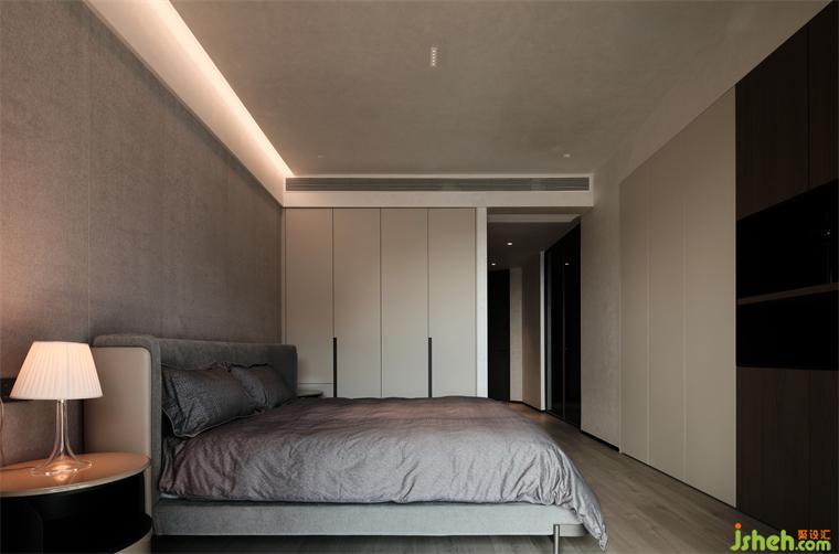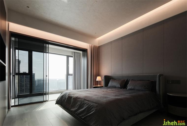 柔和的灰色可以營(yíng)造平靜的氛圍,用于臥室背景色最適合不過(guò)。陽(yáng)臺(tái)與睡眠空間用一扇黑玻移門進(jìn)行阻隔,它既有玻璃的通透輕盈,又帶著黑色的神秘深邃。