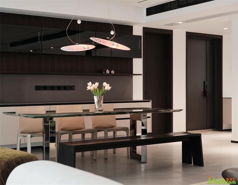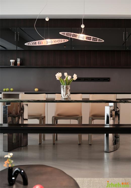 石材、木質(zhì)、不銹鋼等元素的融入,進(jìn)一步將餐廳的簡(jiǎn)練、大方展露無(wú)遺。精心選擇的燈飾設(shè)計(jì)精巧、極具漂浮感,也為每一次用餐增添視覺上的享受。